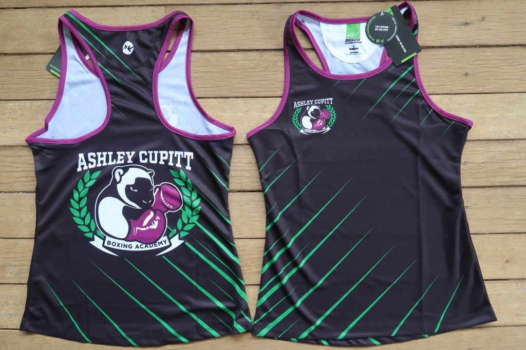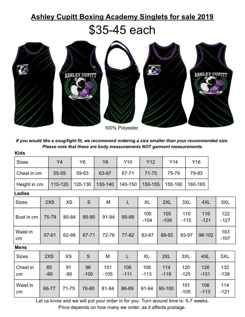 Singlets are black with colours (as per pic) with our logo on them. Polyester. You are able to try them on over your shirt before class (to keep them nice, in the event of trying a few sizes).