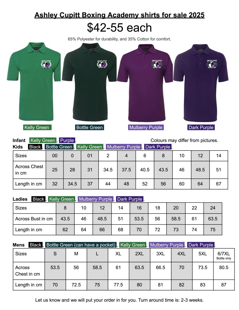 Sizes are Adult unisex: XXS – 6XL. We’ll measure you at the gym to get the correct sizing.